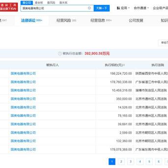 天眼查法律诉讼信息显示,2月19日,国美电器有限公司新增3条被执行人及恢复执行信息,执行标的合计3.8亿余元,涉及金融借款合同纠纷等案件,执行法院为陕西省西安市中级人民法院、广东省湛江市中级人民法院、淄博市张店区人民法院。